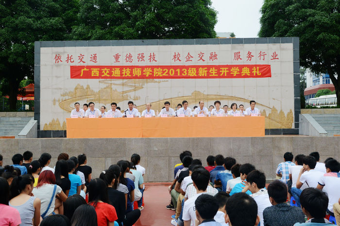 韦红教院长在典礼上致辞。他代表学院党委、领导班子和全院教职员工对2013级新生的到来表示热烈的欢迎。他向新生介绍了学院的办学历史、建设规模、专业设置、教学成果等各方面的情况。他指出,广西交通技师学院隶属自治区交通运输厅,是一所培养高技能人才为主,以汽车和交通相关专业为龙头,集全日制学历教育、远程高等学历教育、汽车驾驶培训、职业技能培训与鉴定为一体的国家重点、国家示范学校,也是国家级高技能人才培训基地和广西陆军预备役步兵师修理营所在地。作为广西为数不多的国家示范学校,广西交通技师学院是有许多其他学校不同的办学特色和独特优势。同学们选择到我院就读,相当于给了自己人生三次选择机会,毕业后不仅可以有选择两个以上岗位即就业机会,又可以选择直升区内高职院校就读的机会,还可以有直升广西师范大学等广西一流大学就读全日制本科的机会,迈向成功的人生道路四通八达,畅通无阻!